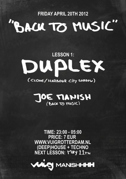 Het nieuwe Rotterdamse initiatief ‘Back to music’ laat de heren op vrijdag 20 april een gastcollege geven in Vuig. In een 3 uur lange set geeft Duplex muziekles waarbij gedanst mag worden.