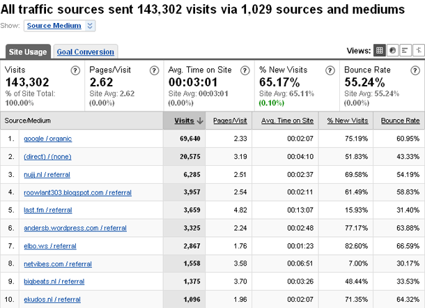 De meeste bezoekers komen op Eclectro via een zoekmachine, waarbij Google onverminderd populair is. Direct naar de site komen (bijvoorbeeld via een bookmark of door het adres in te typen) gebeurt ‘slechts’ in 15% van de gevallen, maar dat is eerder gemeengoed dan uitzondering voor een relatief kleine site (in vergelijking met – zeg – nu.nl of Hyves). Nujij, elbo.ws, Ekudos en Last.fm zijn ook goed voor het nodige verkeerd, terwijl Eclectro-blogger Roowlant vanaf zijn eigen (ter ziele gegane) website nog altijd een paar duizend man doorsluist. Ook de Zweedse Anders_B en zijn eindeloze collectie livesets is een goede leverancier van mensen, evenals mijn eigen (even hard overleden) Bigbeats. Netvibes blijkt onder Eclectro-bezoekers de favoriete rss-lezer te zijn.
