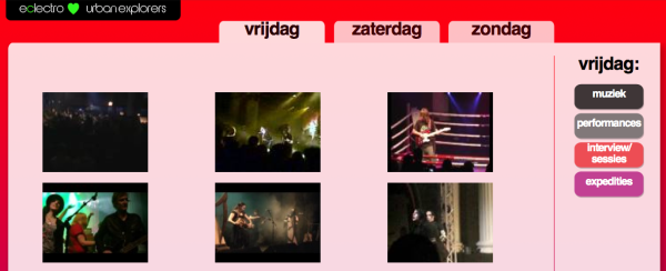 Ten eerste is er wederom een aparte festivalwebsite (dit jaar van de hand van Daan Louter) waar we onze verslagen plaatsen. Net als vorig jaar kiezen alleen voor video. De combinatie van bewegend beeld en geluid biedt in onze ervaring alles wat nodig is om een festival weer te geven. In tegenstelling tot vorige jaren gaan we niet alles direct online zetten, maar zijn er een aantal momenten per dag dat we een selectie maken uit de gemaakte video’s, en deze vervolgens publiceren. Elke ochtend, middag en nacht kun je dus een nieuwe verzameling verwachten, en zo je avond terugkijken of zien wat je gemist hebt. Ook doen we exclusieve muzieksessies met artiesten, interviews en recensies.